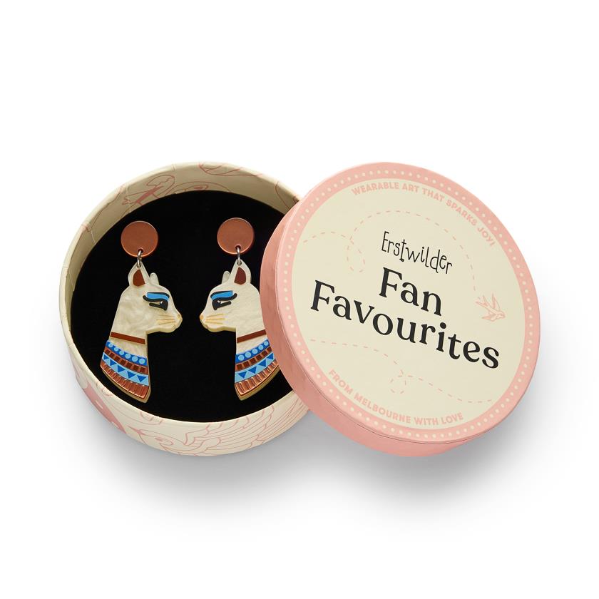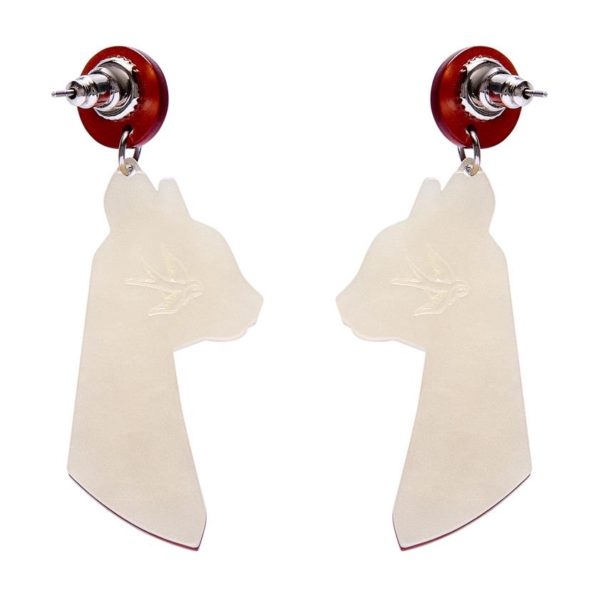 Originally released in 2022 as part of the Egyptian Revival range, this much-loved design returns for the very first time in a striking new cream colourway. This new edition offers a fresh perspective while staying true to the strong silhouette and symbolism that made it so popular. Hand-assembled from layered resin with carefully finished details, the Bastet the Protector Brooch drop earrings exude a timeless and quietly powerful presence.