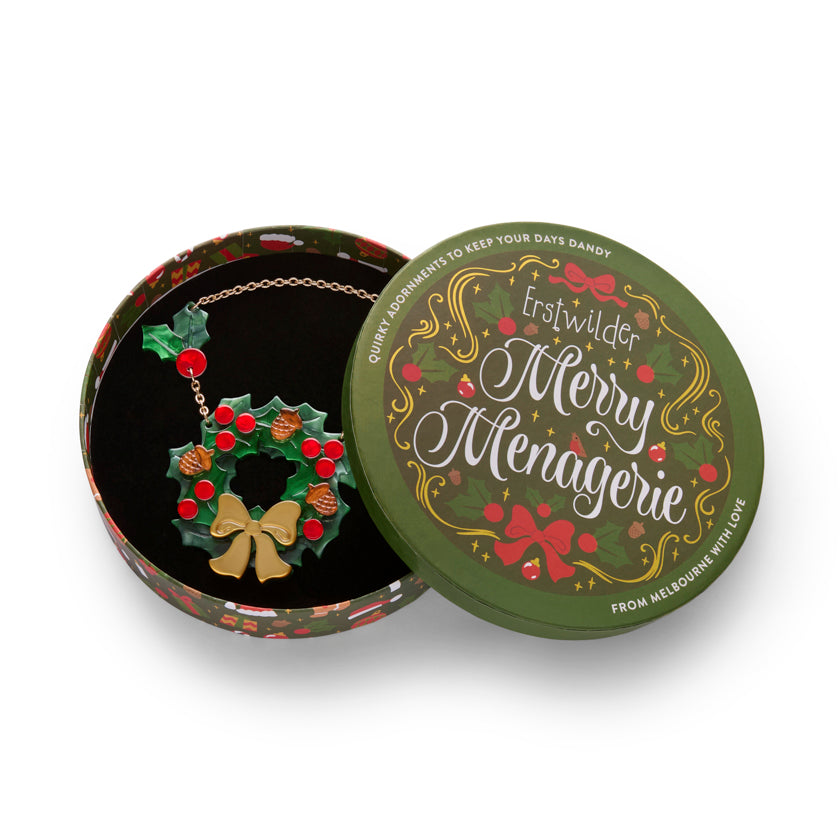 A classic symbol reimagined in lush green resin, the Forest Wreath necklace shines with acorn and berry detailing, complemented by a golden bow. Sophisticated yet playful, this stunning statement necklace brings a whole lot of front-door charm to your every outfit.